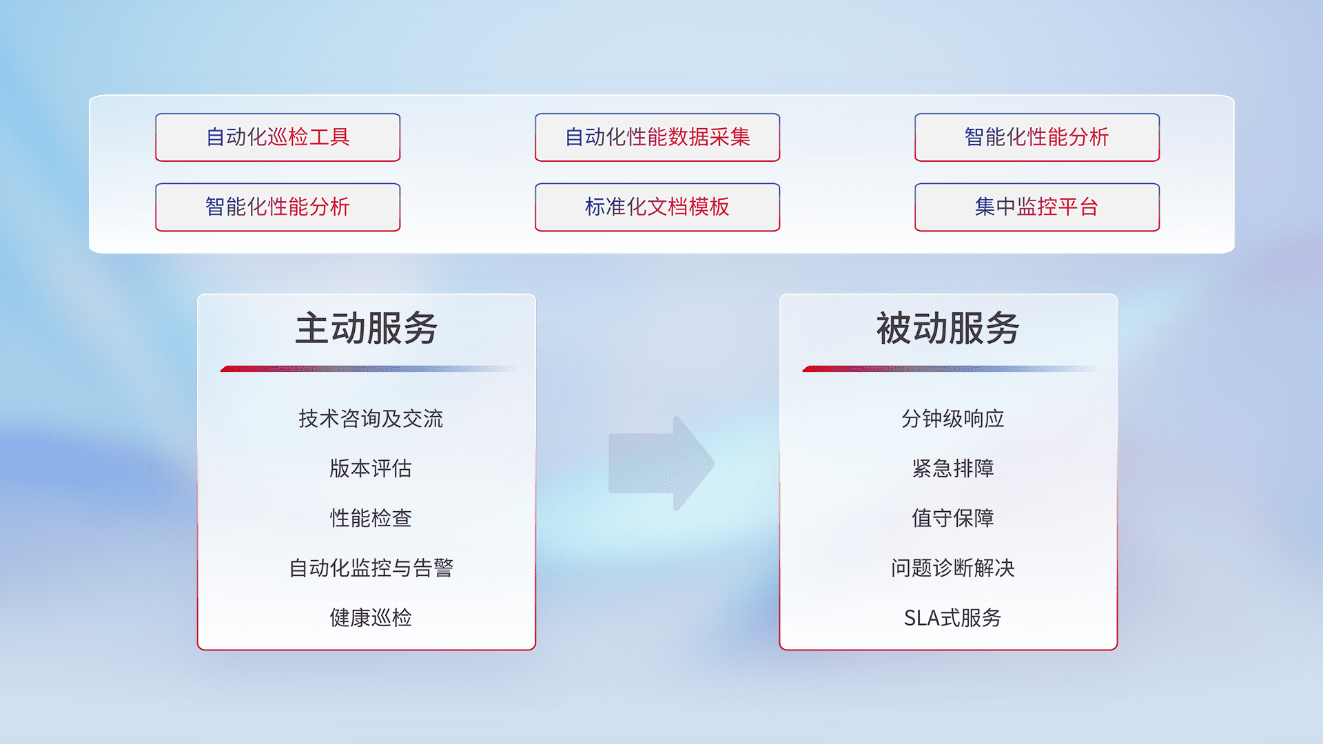 智能化工具和标准化文档,,,,保障服务质量,,,提供主动服务(包含技术咨询、、版本评估、、、性能检查、、、自动化监控与告警、、健康巡检)和被动服务包含(分钟级响应、、紧急排障、、、、值守保障、、、问题诊断解决、、、SLA服务)。。